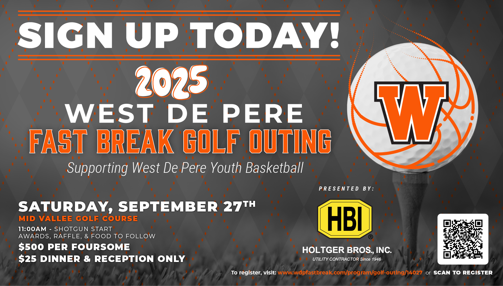 The 5th annual Fast Break Golf Outing is here. Don't miss the fun...come out and join us for this great fund-raising event. We are continuing our organizational goal to raise funds to support youth basketball in West De Pere, as well as support our high school teams in their continued success! The event will include 18 holes of golf, dinner, prizes, and raffles to follow in the clubhouse. We hope to see you there!